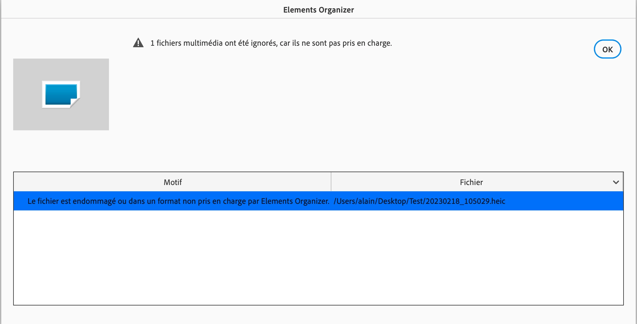 Erreur d'importation HEIC dans Photoshop Elements Organizer 2024
