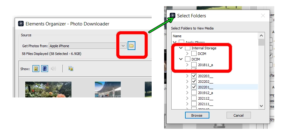 What version of Elements are you using?  If you have Elements 2022, click on the browse folder button in the Adobe Photo Downloader, and what do you see?  Do you have two DCIM folders as shown in the following screenshot?