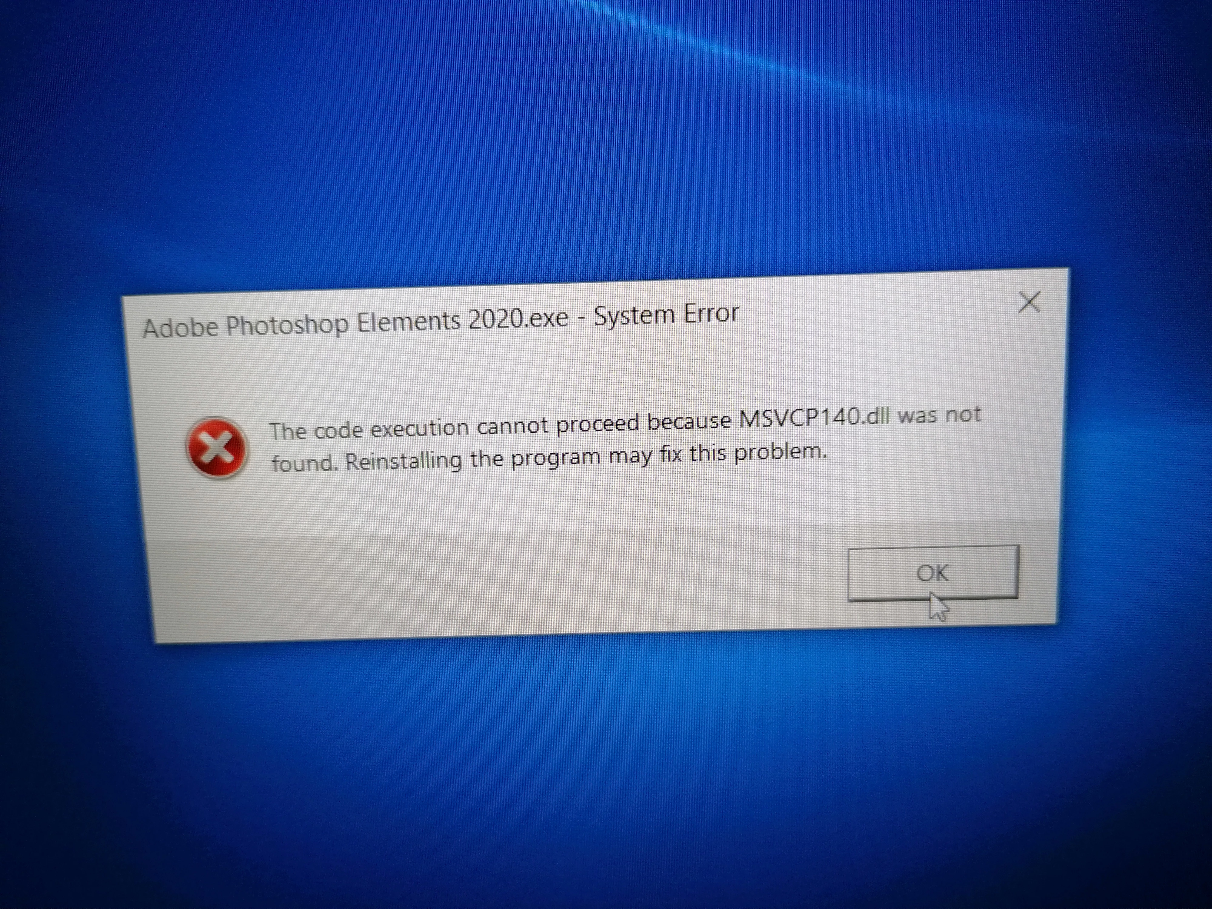 Take a look at the response from an Adobe employee in this thread. You may need to manually install some Microsoft files, but the Microsoft webpage that deals with this issue is somewhat confusing. And I don't have any particular experience with this issue so I am reluctant to make some suggestions myself. You should still be entitled to support for the program so maybe you should contact Adobe Support by clicking on the blue Contact Us button under the Support menu on the Adobe.com site. Or did the program come with your Dell computer? In that case, try contacting Dell because it seems to be a problem with the OS they have delivered to you.