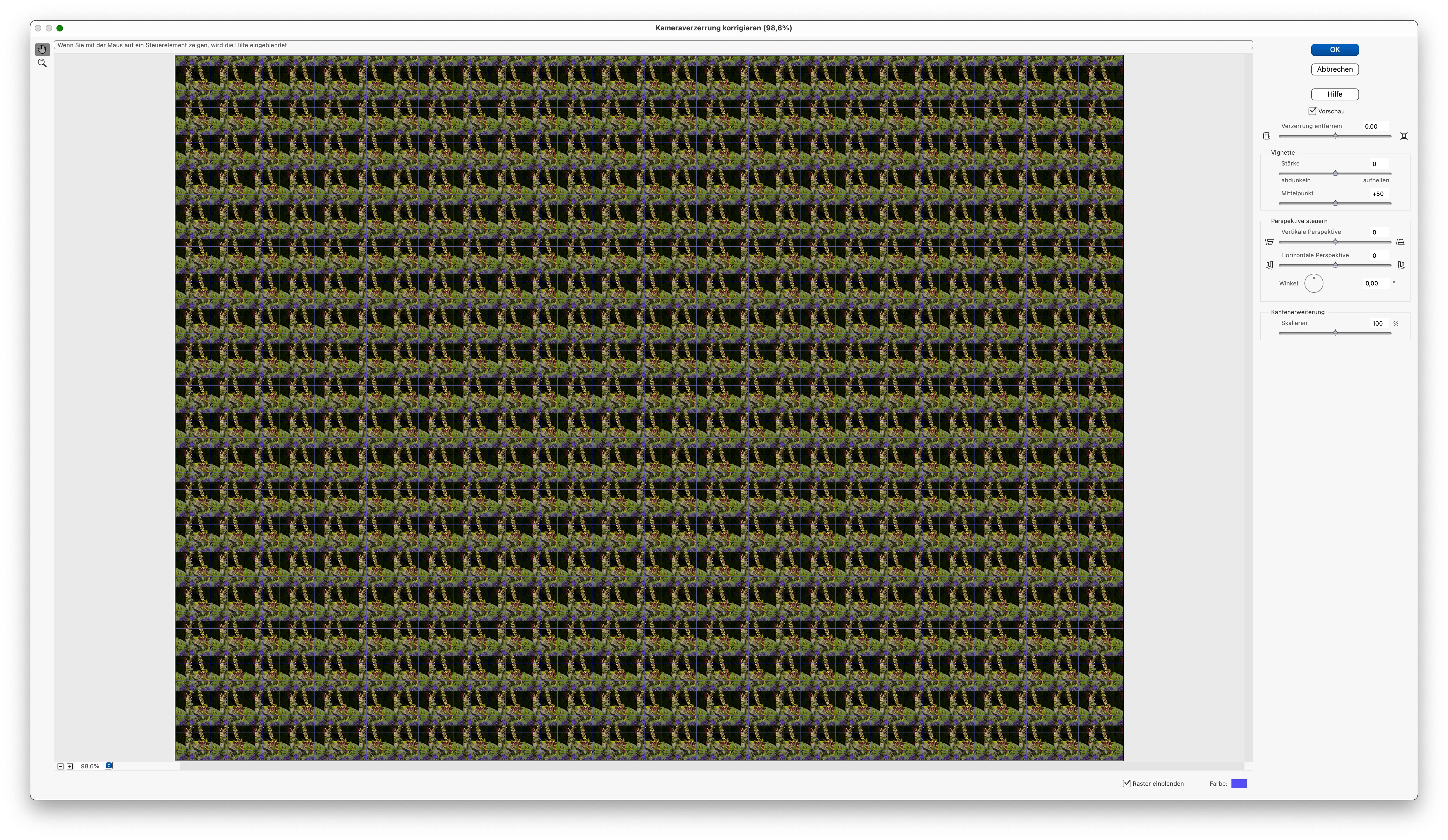 Hello, I am currently taking an exam and have to edit an image with Photoshop Elements using the "Correct camera distortion" filter. When I switch on the filter, a rasterized image appears that does not correspond to the actual photo. I have attached an image. Does anyone know this effect and can tell me how to fix it?
