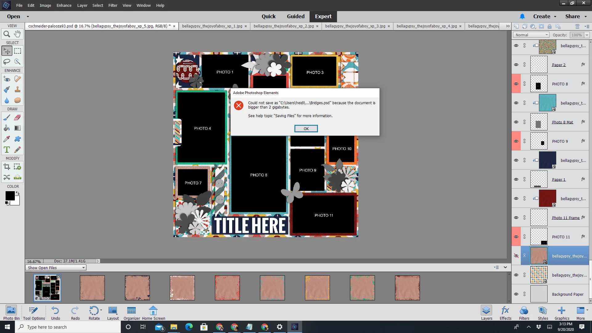 I started getting this error a few years ago when I was using PSE 14. I thought maybe my computer and software were too old, so I bought a new computer and PSE 2018. Still got the error. Gave up on scrapbooking for a couple years, then thought maybe it was a glitch and tried 2020. STILL getting the error. The thing is--there's no way this file is even close to 2 GB. There's just not that much stuff in it. It's a basic template with some layers in it. And if I know how to read PSE (maybe I don't), the size in the bottom left-hand corner clearly states that this file is 37.1 MB--nowhere near 2 gigs!