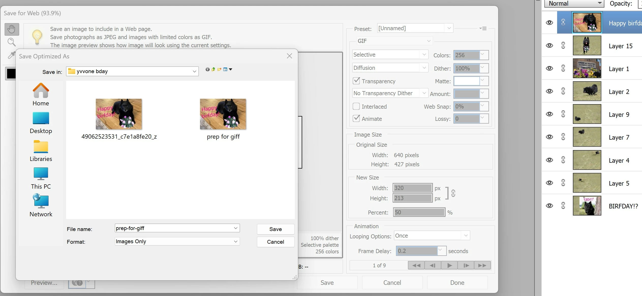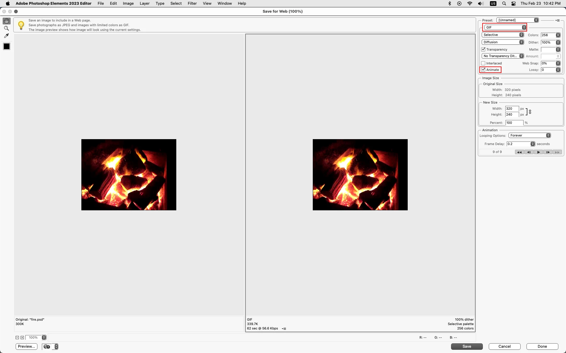 cannot convert a 9 layer psd file as an animated GIF file. Using elements 2023 with windows 11. Am only offered options to save the images which generates a files containing the photos in the photo bin.