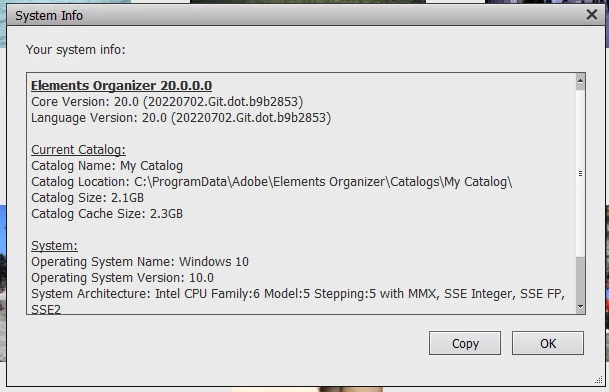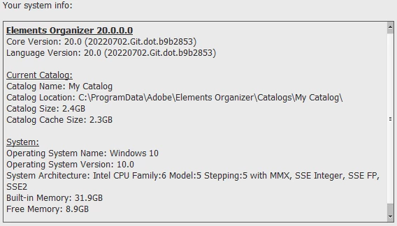 I had started the backup with the Elements Backup feather before receiving your last message but it has since aborted at 7% after 4 days of running, so I will try to do it as you mentioned above instead. I currently have all of my photos on an external drive and my current catalog folder on my hard drive (I've copied my system information below and am wondering if you see anything in the information that I should take note of or clean up).  Also, do you recommend I back up my current catalog folder to an external drive since it's currently on my computer's drive? What about my photos? Should I back those up to my computer hard drive since they are already on an external drive?  I've not done a zipped folder before. I don't suppose you can walk me through that?