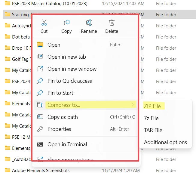 I assume your computer is Windows 11.  If it is, there is an easy way to zip the catalog folder.  In Windows FIle Explorer, right click on the folder and choose Compress to. . . .  from the context menu.  A sub-menu will open and you should choose ZIP.  A new file will be created which you can rename if youi want to, but that is not necessary.  Just make a note of the proposed name so you can find it again.  If you don't see the Compress to option shown in my screenshot below, then select the Send To option from the context menu and choose Compressed (zipped) File.  (I have other zipping software installed so I'm not sure what the Windows options are.)