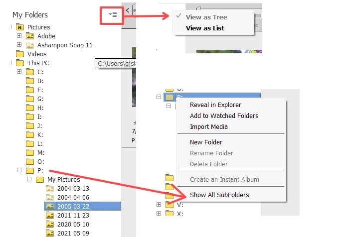 • Right click on each drive or main photos folder where the photos are stored, and choose Show All Sub Folders.