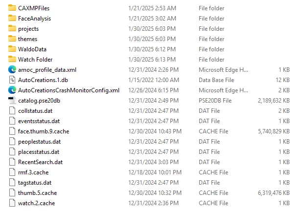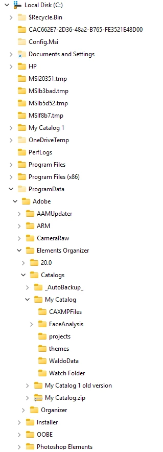 I went to the PSE2022 default location for My Catalog on my internal HDD/C drive and zipped that folder, copied the zipped folder to my external HDD/L drive (I have two external HDD on my NAS that have been set up as redundant drives - I treat the 2 drives as just one External HDD although one is named L and the other M).  Below is a hierarachy of my internal HDD/C drive. It still appears this way. I have not deleted anything.