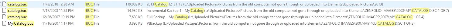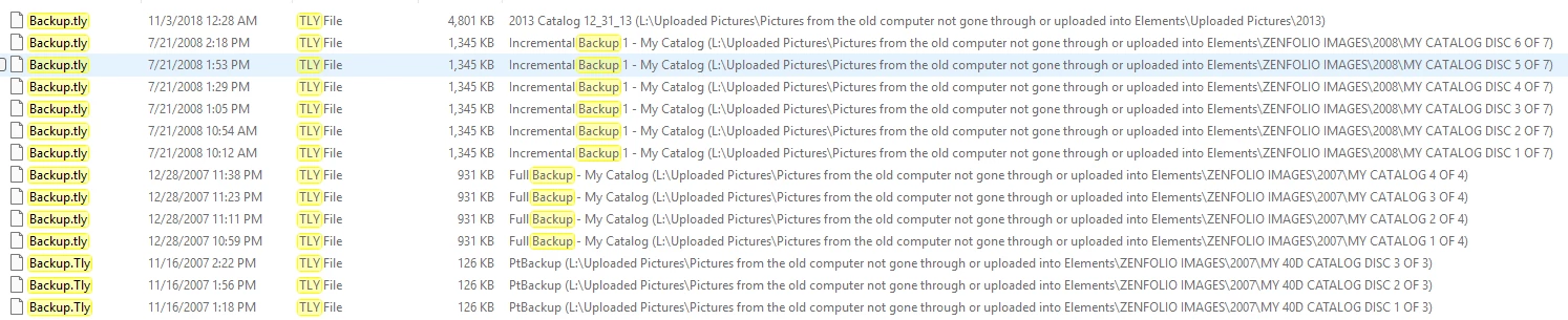 Ok, and this brings me back to the full circle of what I’m hoping to do to find some of these old files. First, I have had multiple catalogs in the past. That is no longer the case, but in the past, I had several catalogs I worked inside of – found the initial workflow logic to be a nuisance and went back to having it all in one catalog. This is where I get anxious with the PSE program. How do I stay away from overwriting any of the files? You said I can do the restore of these .tyl backups  inside my current ‘My Catalog’ and that it will not mess up my current ‘My Catalog’ but recommended I move my database file to an external drive which I did (that was the 3wk process of zipping, moving, and extracting). I’m wondering if I should do some type of full back up or if what I’m doing, as described above, is adequate and won’t cause loss of tags, etc, etc?
