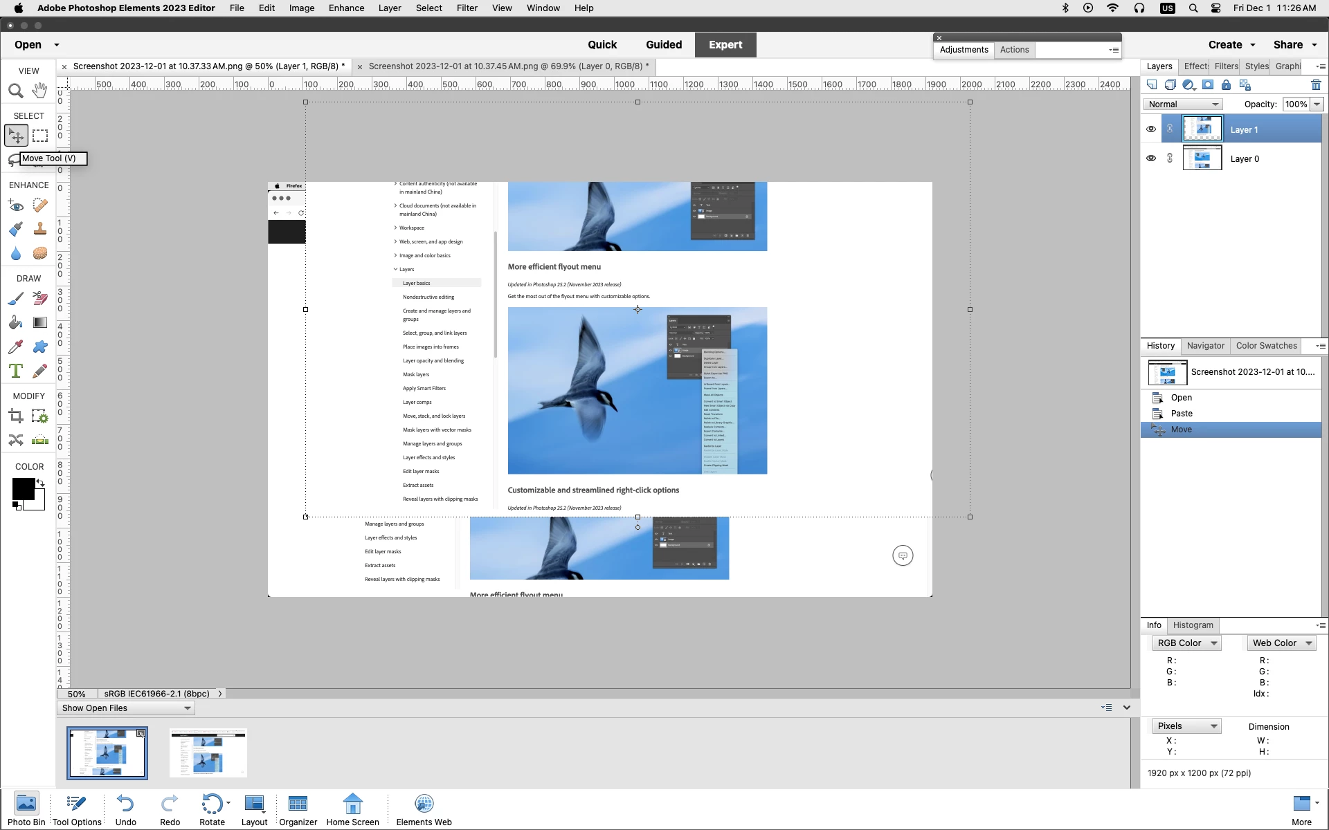 When I copy and paste an image from one tab to another I was then able to slide the pasted image around and over the first image with the hand tool, this no longer works. Why? It seems that the images have been merged. I am not technical so simple answers please, explain jargon and how I navigate to the answer, thanks. (December 2023)