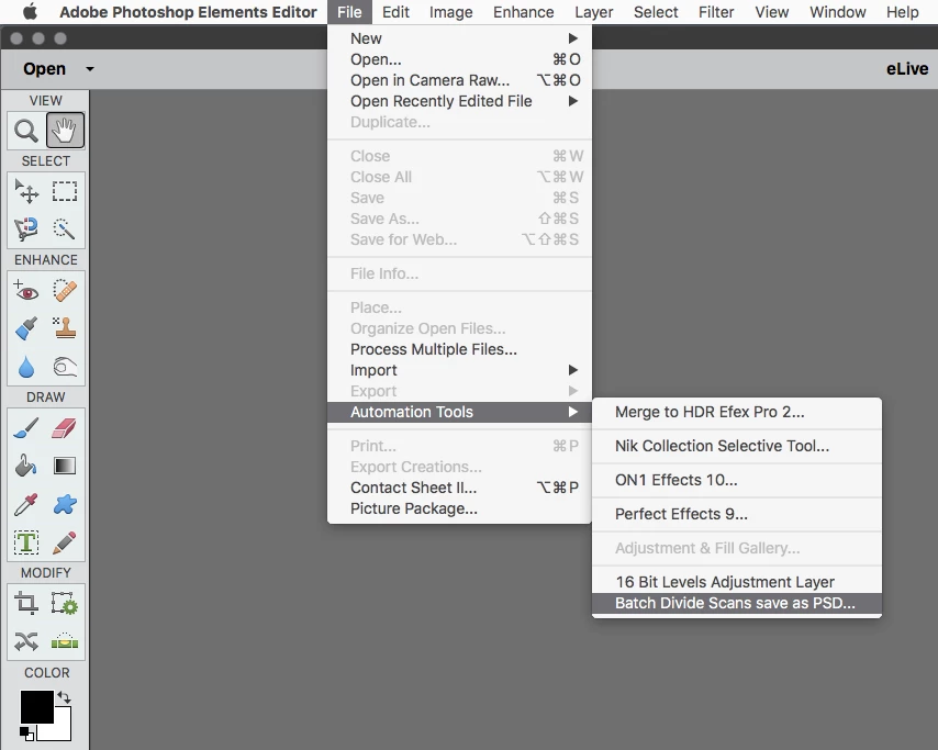 I've found the menu for batch commands in PSE, but there is no option for dividing scanned photos.