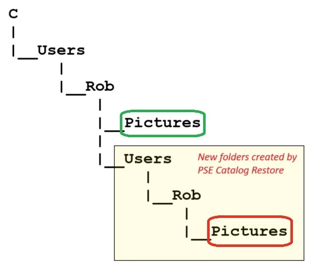 So, after following the instructions I found on Adobe's website, I successfully backed up my old PSE-11 catalog (~40,000 photos) from a Windows 10 computer and then ran "Restore Catalog" on my new Windows 11 computer with PSE-2025. After processing for a long time, it appears to have successfully restored all of my photos, but unfortunately they are in the wrong location. The restore created a set of sub-folders within my main folder (see attached diagram) so that now my pictures that were originally in C:\Users\Rob\Pictures (shown in green below) are instead placed in C:\Users\Rob\Users\Rob\Pictures (shown in red below).