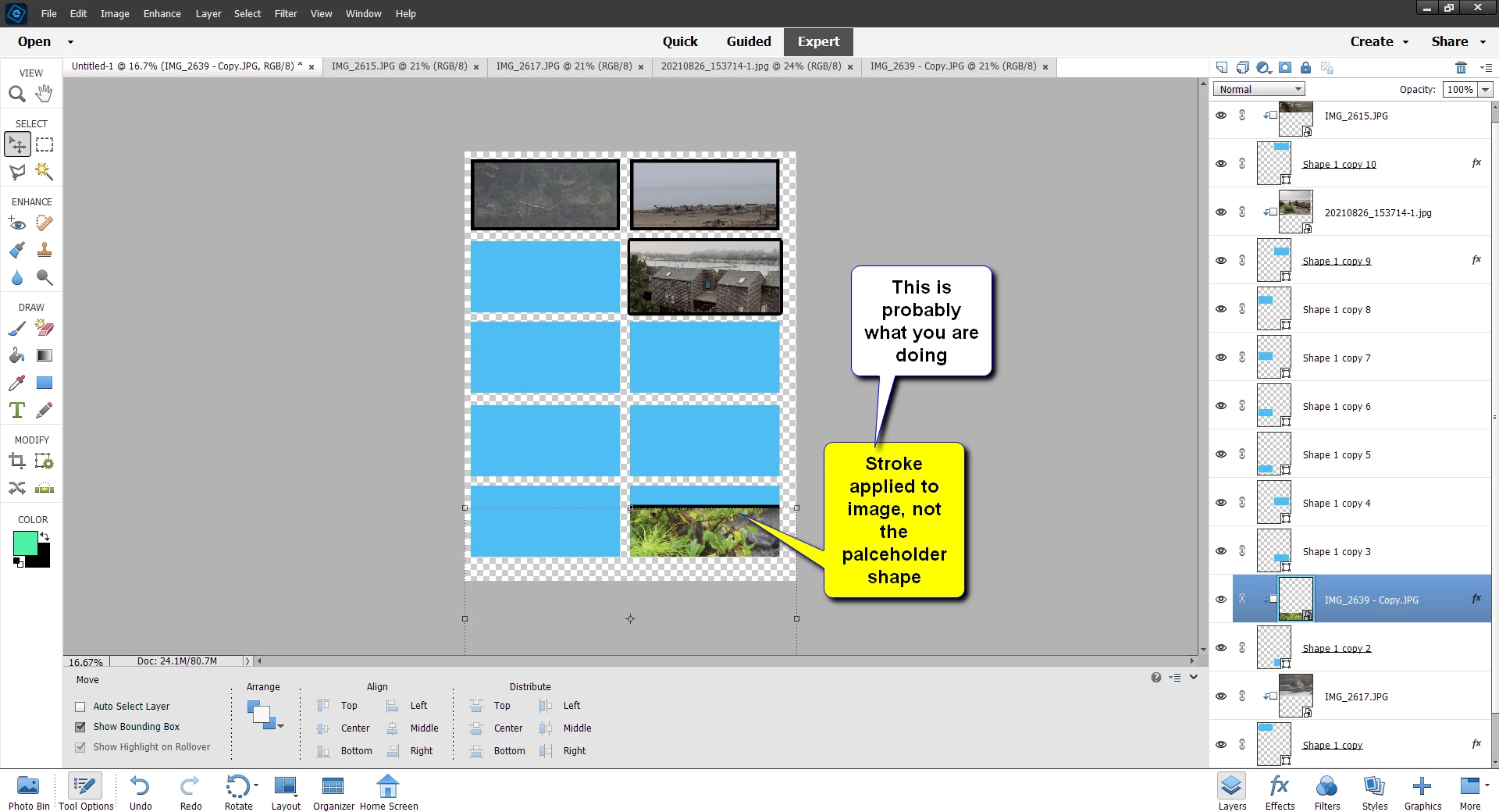 Please can someone help me with this issue. I am trying to create a custom Photo Collage template in PSE 2022 (due to the restrictions of 8 photos in included guided templates) by following an online YouTube tutorial. But the photos when added are covering the stroke outline?