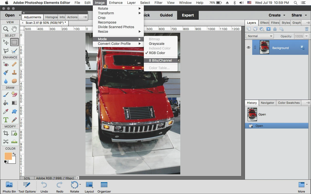 How can I convert photos scaned at 48 bits to 24 bits or lower?