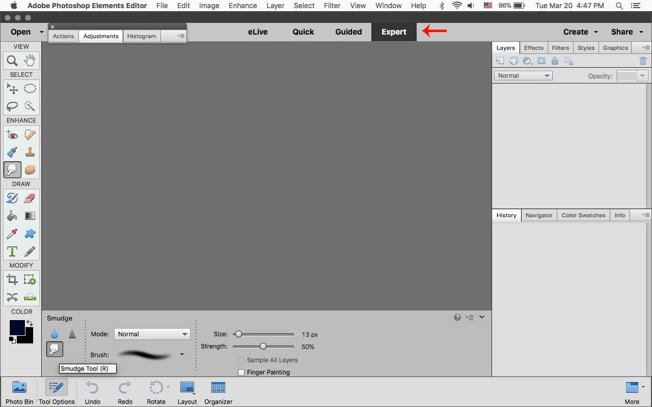 How do I add the SMUDGE TOOL to Photoshop Elements 2018 Toolbar?