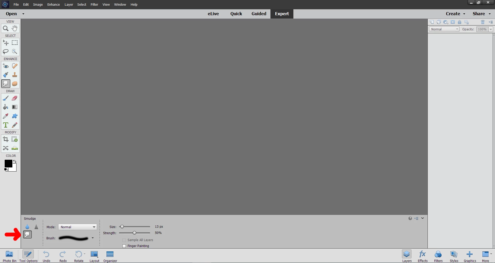 How do I add the SMUDGE TOOL to Photoshop Elements 2018 Toolbar? I just installed Photoshop Elements 2018. My last Photoshop was CC2. I frequently used the SMUDGE tool with CC2. I cannot find the same tools in Elements 2018. How do I add the tools from CC2 to this toolbar?
