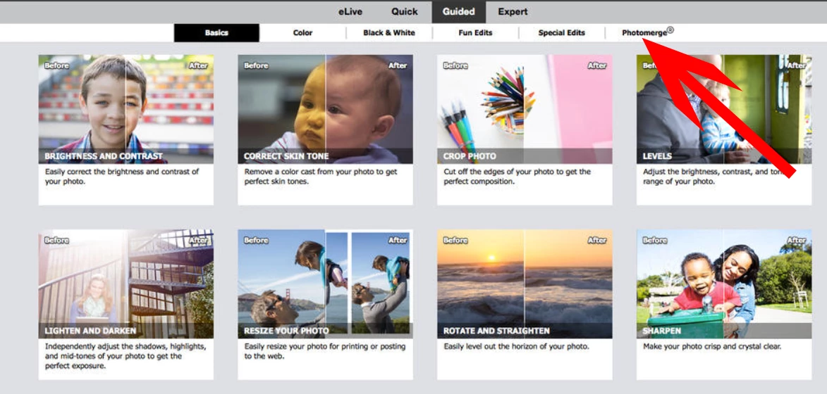How do I get Photomerge Compse to appear in the ENHANCE menu?