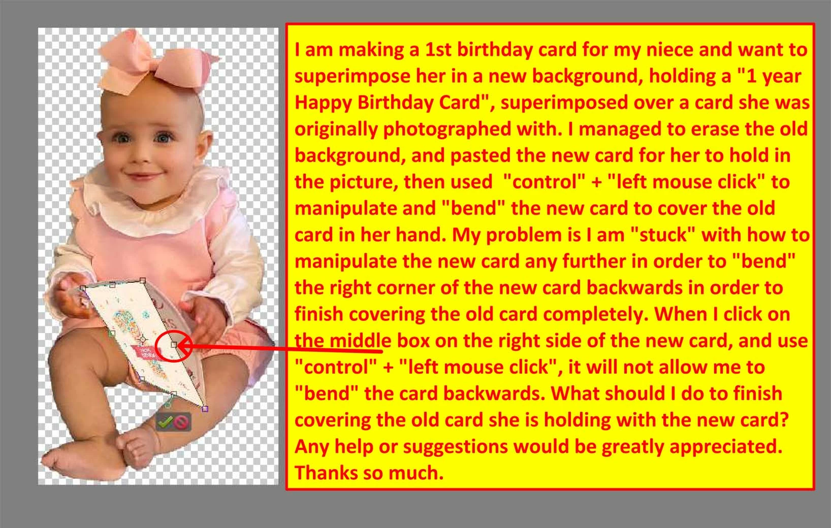 I managed to erase the old background, and pasted the new card for her to hold in the picture, then used "control" + "left mouse click" to manipulate and "bend" the new card to cover the old card in her hand. My problem is I am "stuck" with how to manipulate the new card any further in order to "bend" the right corner of the new card backwards in order to finish covering the old card completely. When I click on the middle box on the right side of the new card, and use "control" + "left mouse click", it will not allow me to "bend" the card backwards. What should I do to finish covering the old card she is holding with the new card? Any help or suggestions would be greatly appreciated. Thanks so much.
