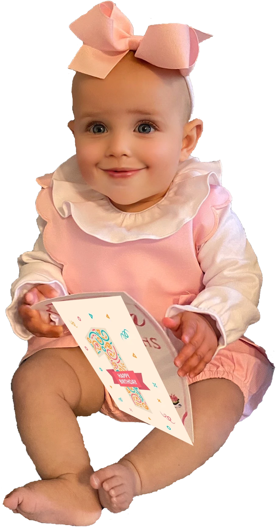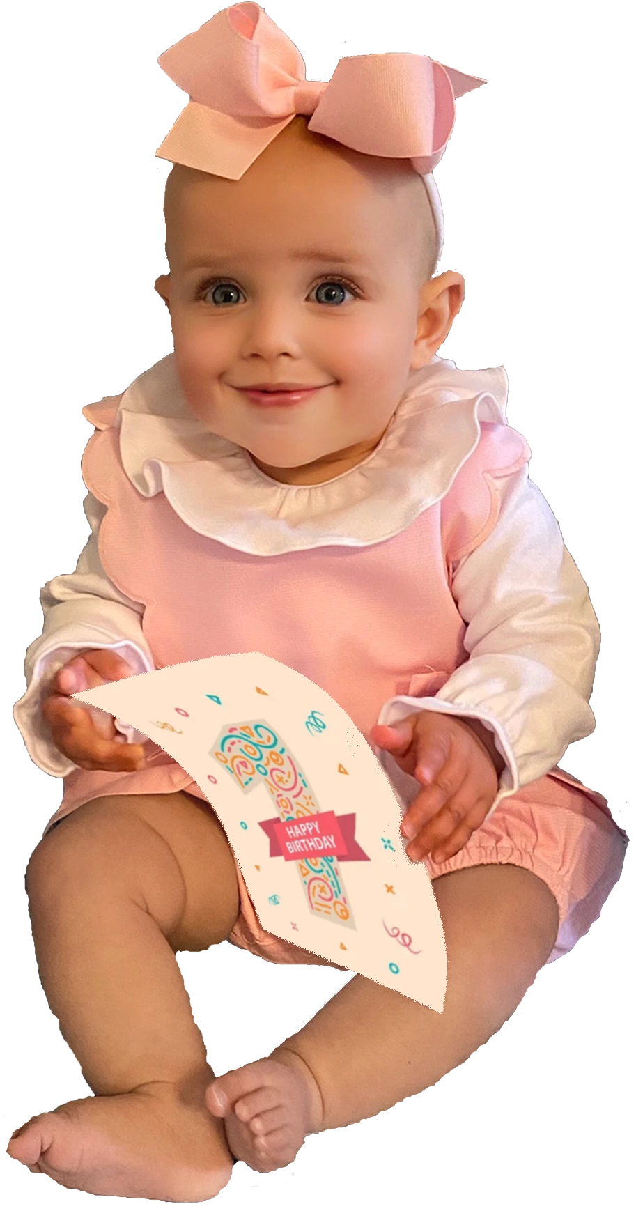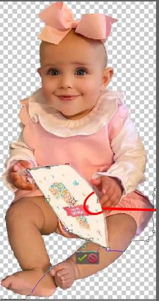 I am making a 1st birthday card for my niece and want to superimpose her in a new background, holding a "1 yar Happy Birthday Card", superimposed over a card she was originally photographed with (copy of photo (as it currently is edited) is pasted below, and is also attached to this post, for your reference). [Post continued after pasted photo ... ]