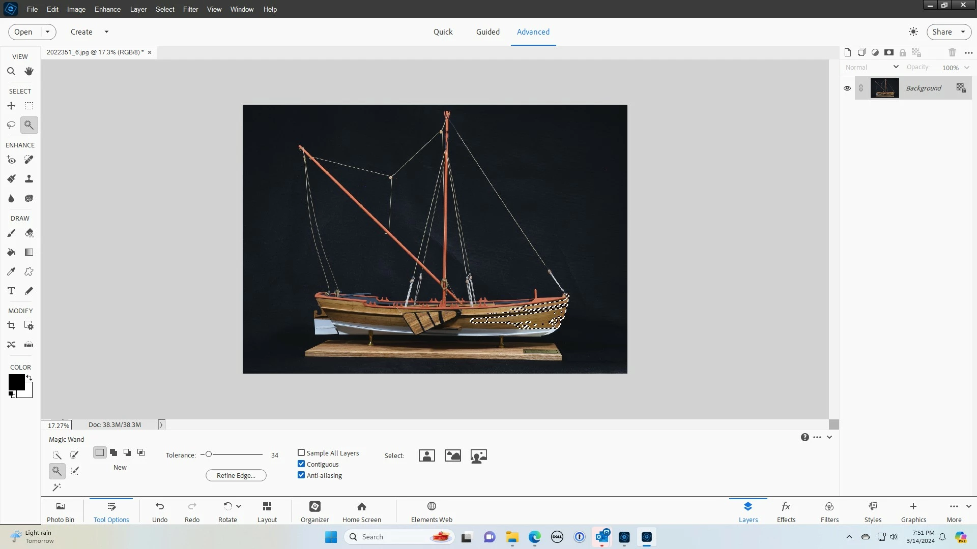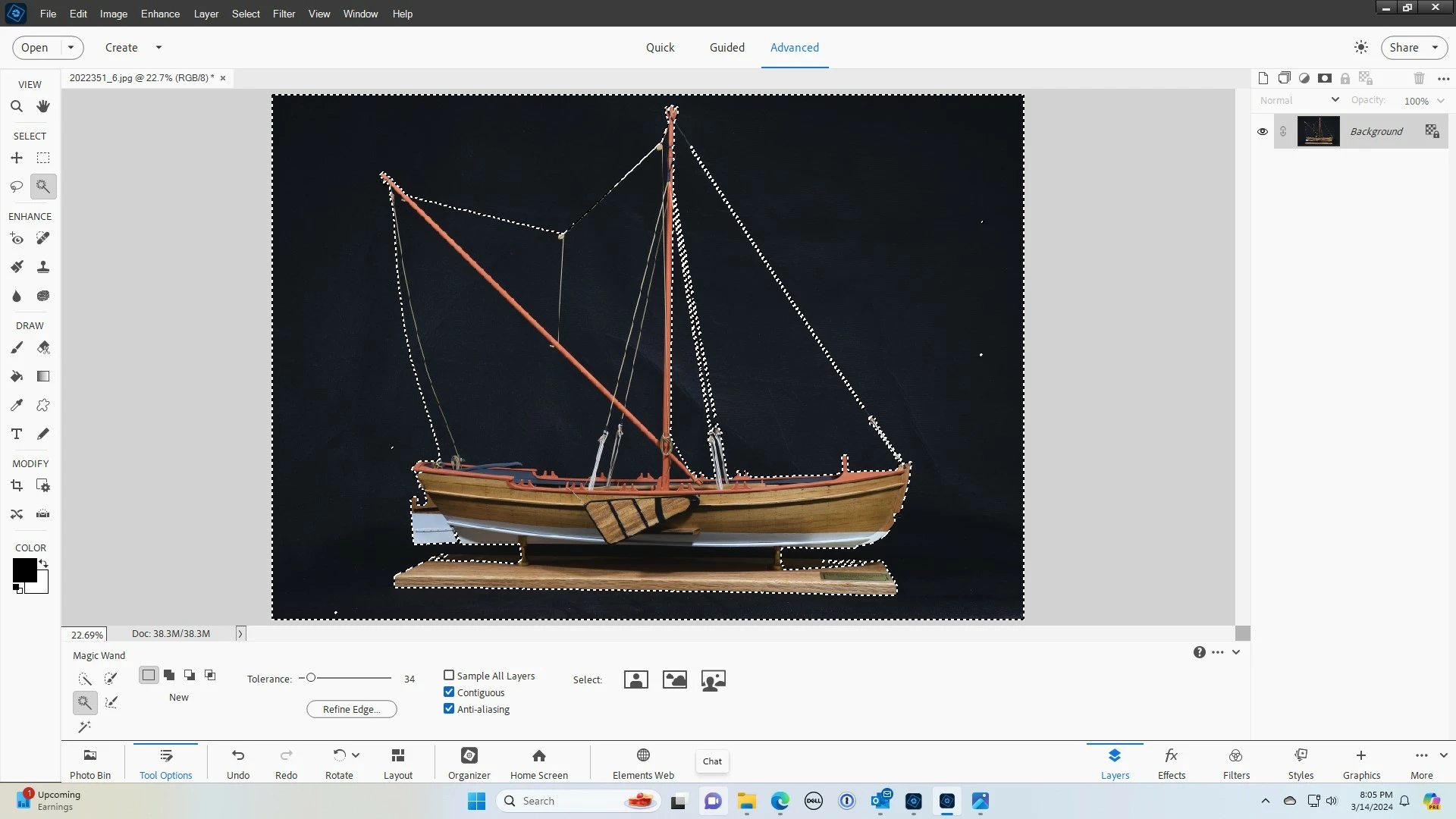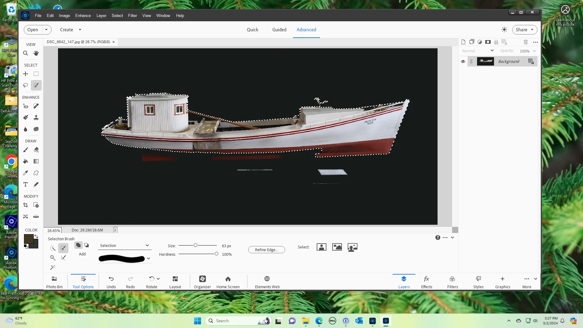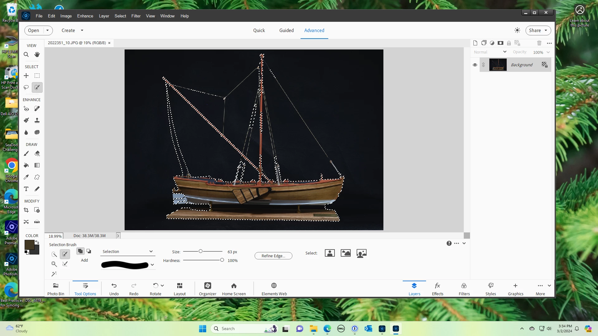 I recently purchased Adobe Photoshop Elements 2024, in part for its inclusion of the option to auto select backgrounds and subjects. I tried out the feature recently after photographing several model boats at our local maritime museum, and was disappointed in the results. The Select Background and Select Subject tools would outline the boat model but sometimes did not include the base or stand (or all of it) it rested upon, outline the boat model but not include the rudder and propeller (it followed the hull outline), outlined the leading edge of the sail but missed the mast stay line just ahead of it or jumped between the two halfway down the sail, would get very confused by models with rigging but no sails (select part of a rigging line and then jump to another and reverse direction), etc. My question for the community is, "Is there a way to refine a segment or portion of the selection once the program has performed its automated selection in Photoshop Elements 24?" Two screenshot examples are attached. Thank you.