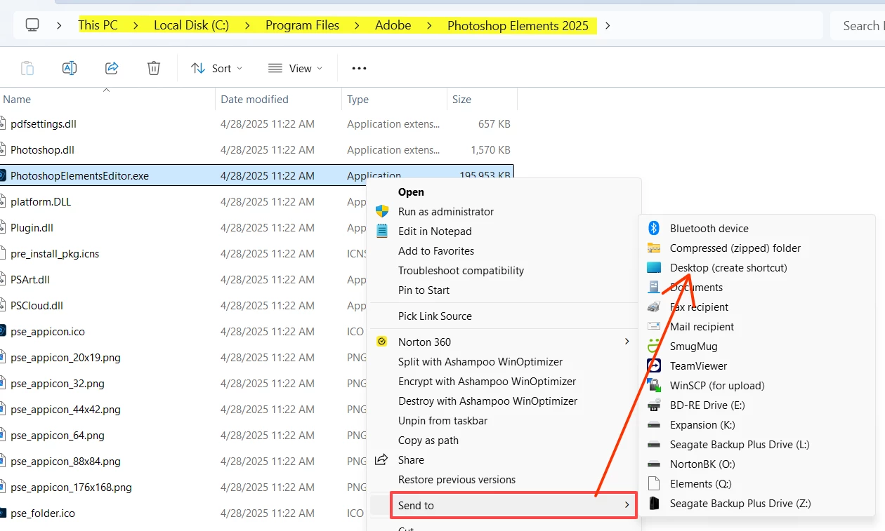Go to the C:\Program Files\Adobe\Photoshop Elements 2025 folder and right-click on the file named PhotoshopElementsEditor.exe. From the context menu, choose Send to>Desktop (create shortcut). This will place an icon on your desktop which you can rename so as not to confuse with the regular Home Screen icon that is placed by default on installation. (You may need to first select More Options in the context menu.)