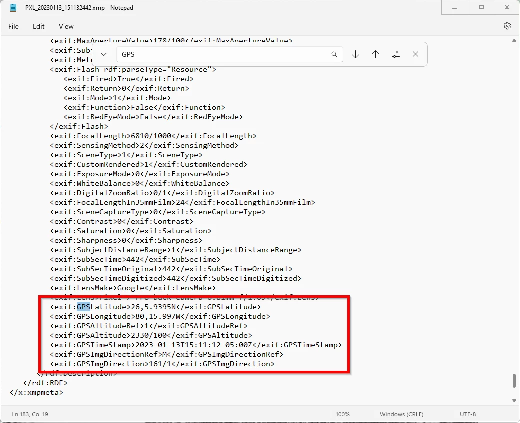 Then, open the exported file with Windows Notepad. Use the Find function to search for "GPS". It's near the bottom of the file. And finally, Copy the info you need to the clipboard.