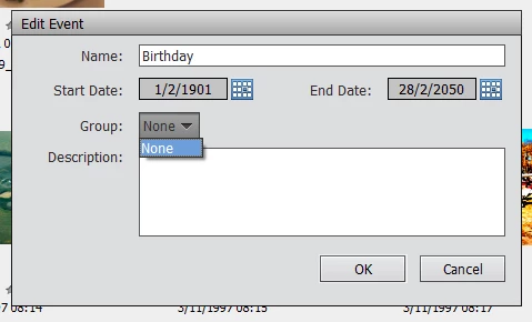 It seems to me that I should be able to create a Group named Birthday and Events that are a subset of that (eg Bob - 2018, Bob - 2019, Jane - 2017) but it doesn't seem to work that way.  What is the meaning of Group and how do I use it?  To date I've created events that recur annually by maximizng the datet range, but that seems to be counterproductive.