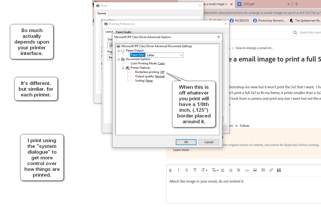 I can enlarge the image in photoshop via view but it won't print the 5x7 that I want. I have also enlarged the image in windows 10 but it still won't print a full 5x7 to fit my frame, it prints smaller than a 5x7. I do know how to take a image from my photos that I took from a camera and print any size I want but not the email image. Hope someone has a simple answer. Thanks