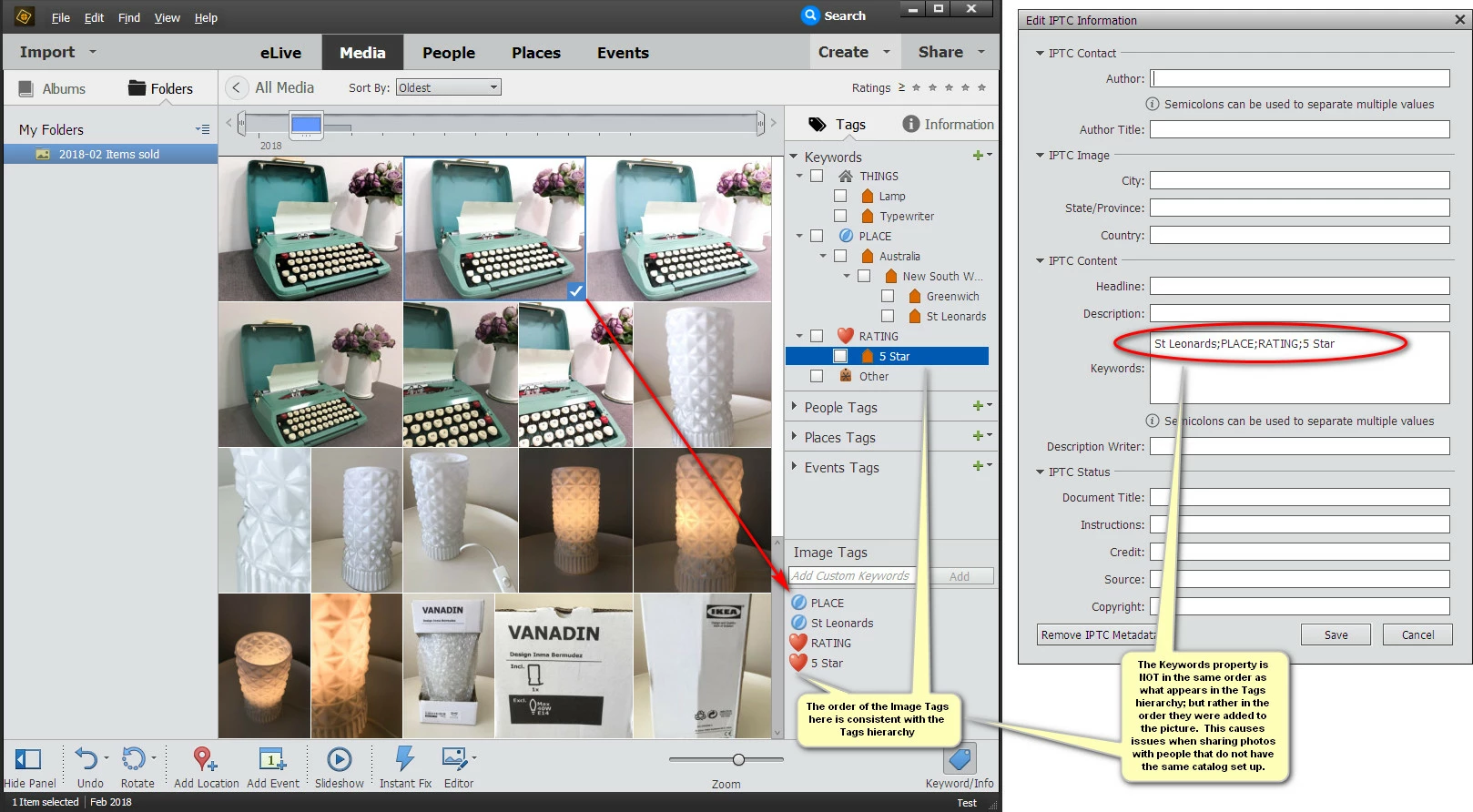 To illustrate why this is important; I have several categories; PEOPLE, PLACE, EVENT, RATING - they are all capitalised to stand out in the Keywords property of the file. In the hierarchy I will have people's names listed so what I see in the hierarchy would be say.....