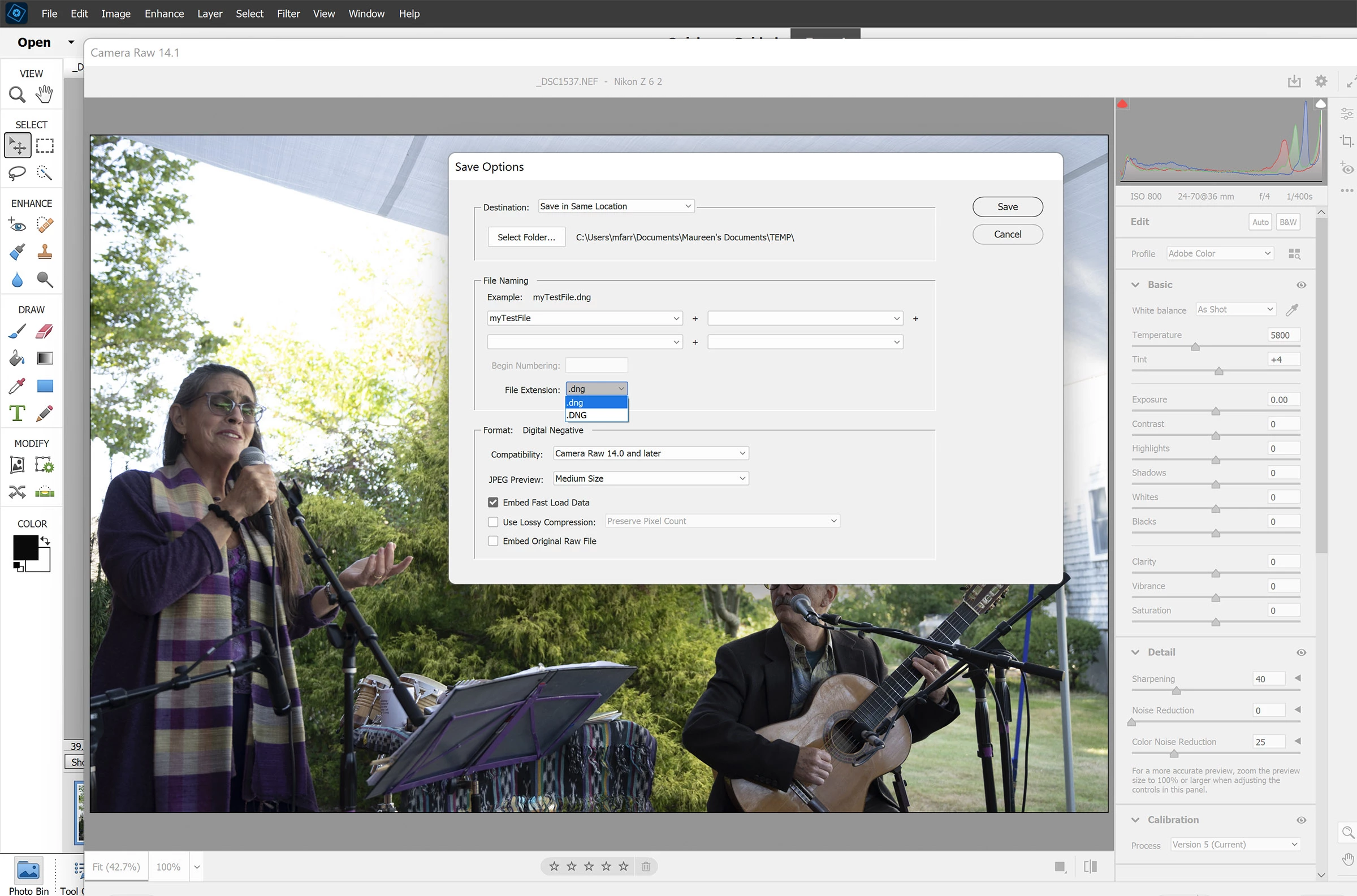 My GF recently got a Nikon Z6II. When she tries to open a Raw file it invokes Adobe Camera Raw 14.1 and it does not have a way to save as a TIF or other file format Elements can edit. It only has a choice of saving as a DNG (digital negative) file. What's the best way to work with NEF files with Photoshop Elements?