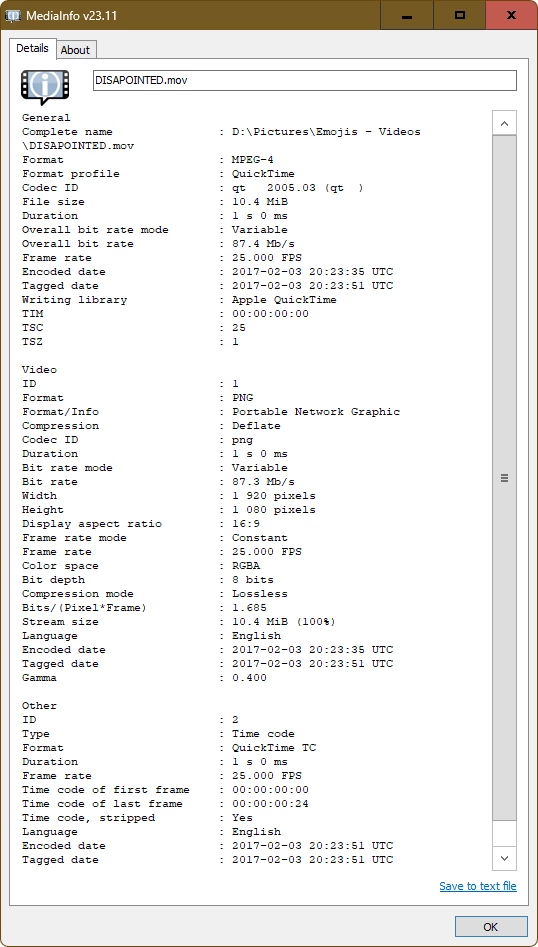 This is the MediaInfo v23.11 detail for one of the MOV files.