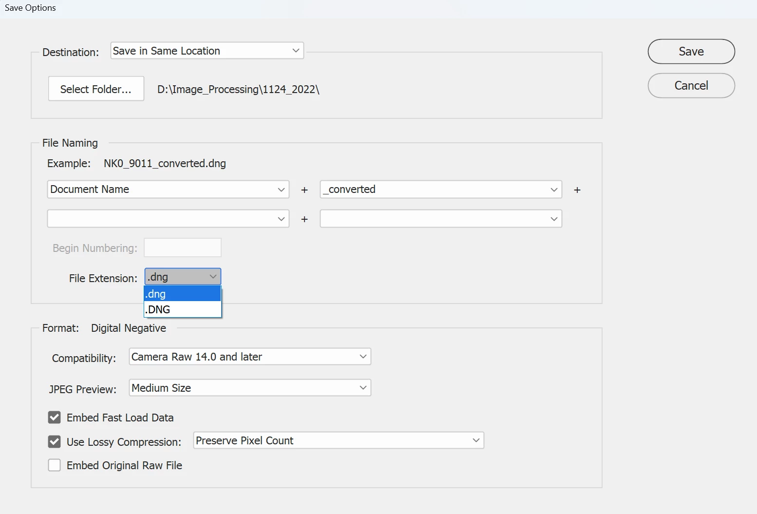 But with the PSE 2023 and ACR (Adobe Camera Raw) plugin. I cannot save as photos to jpeg. But it only shows dng file format.