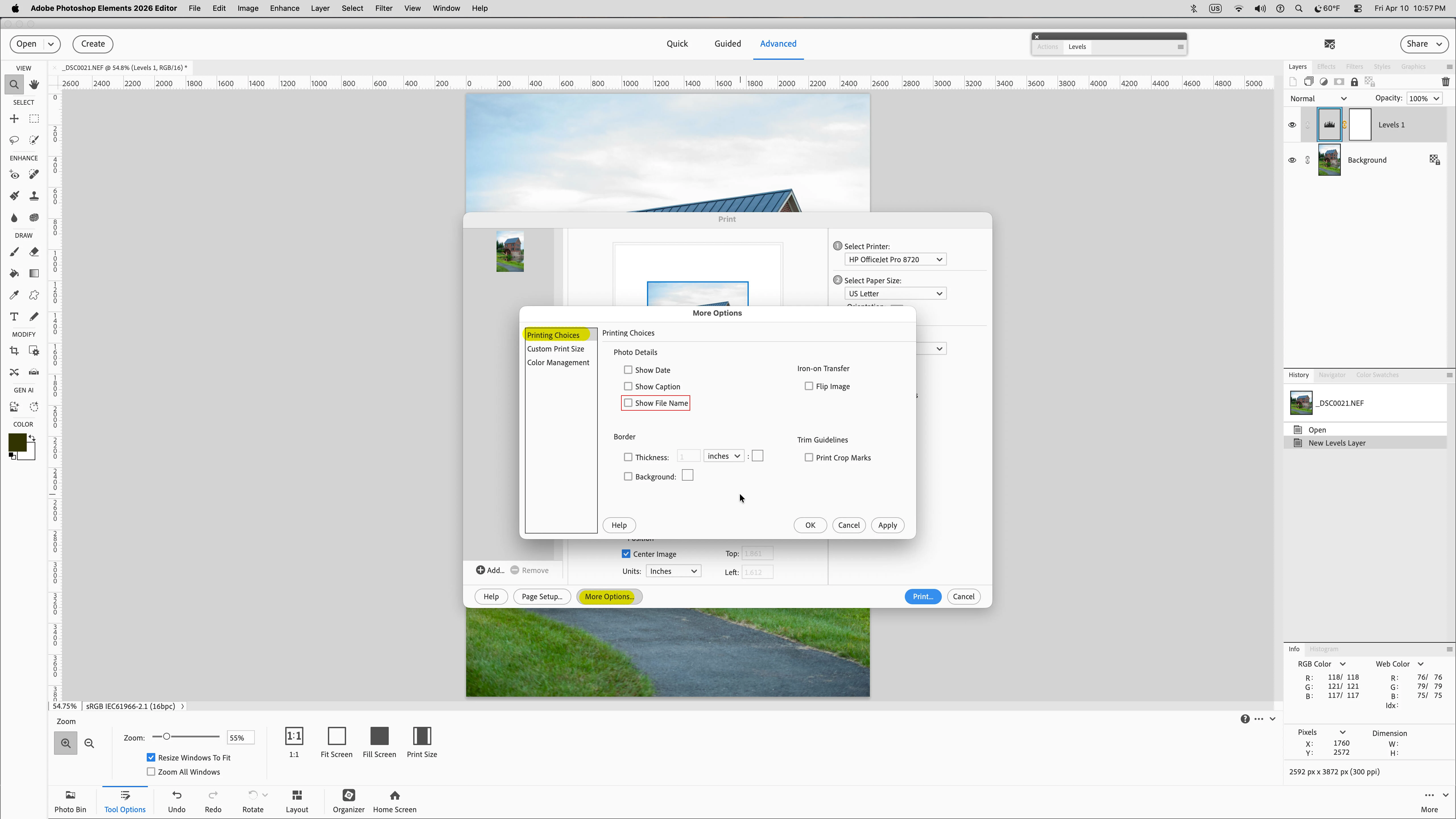 I have an image in a file in PhotoShop Elements. When I bring the image up to print it, it shows the file name above the picture. I don’t know how to get rid of this. Any suggestions, please?