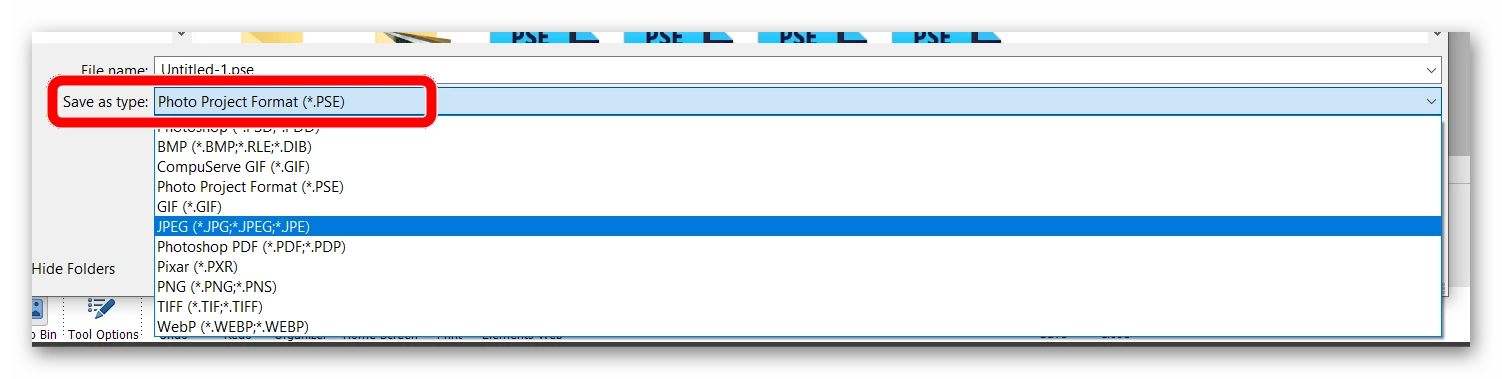 Hi. I want to change formate PSE to JPEG. how do I do it ?
