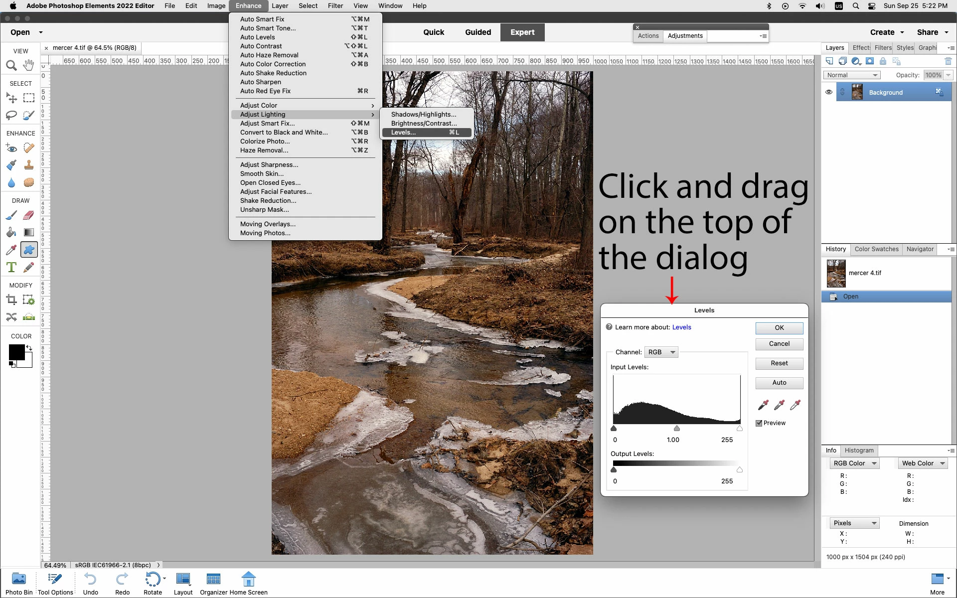 Say I have a picture I want to change the brightness on just one spot. I select that area then go to the Enchance drop down menu and select "Adjust Lighting" and the a selection boix with sliders appears in the center of the image usually cover up the part I selected. I can figure no way to move the box out of the way of the image, and the problem still exists in 2022 and I know it has been a bug in the program since version 6.0.. many moons ago. It's hard to adjust an image you can't see because a dialogue box is blocking it.