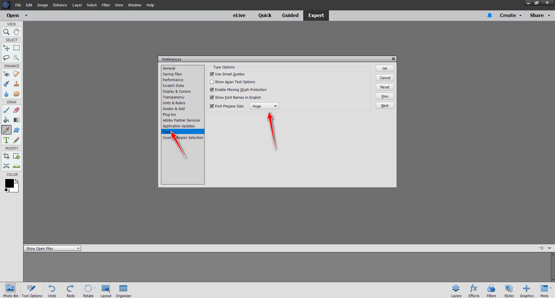 I want to enlarge the fonts in photoshop Elements 18. The only options at Edit>Preferences>Display were "automatic, !00%, and 200%." Automatic and !00% were the same. 200% made the program inoperable. I needed a slider to adjust UI to my old eyes