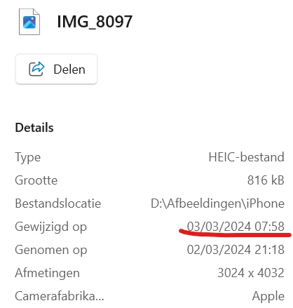 Just bought Photoshop Elements 2024 and was exploring the Organizer functionality. I encountered a for me annoying functionality. When Organizer imports HEIC files, it changes the HEIC file itself as well which results in a changed "changed on" file property. See screenshot below (in Dutch, "Gewijzigd op" = "Changed on"):