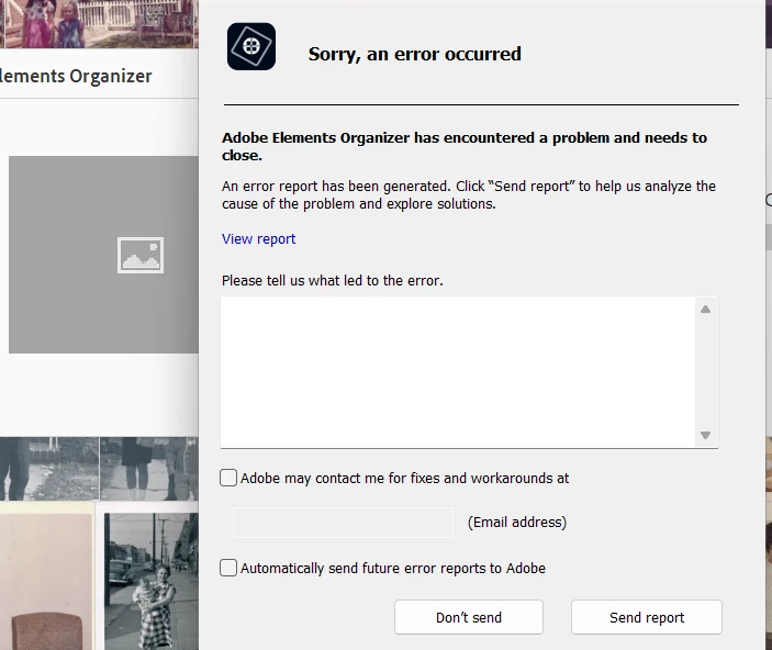 Using Photoshop Elemements 2024 on Windows 11. New install, so I started the import of photos from my iPhone, which completed fine. I start up Organizer and I get a message that there are over 20000 items to import to the catalog. The import starts and then after about 400 items (number is not the same every time) the import fails and I get a popup with message asking if I want to sent a report to Adobe. I say yes the first time, but not subsequent failures. There are no details in the message in the error popup, so I am lost on what to do. Thanks in advance for any help.