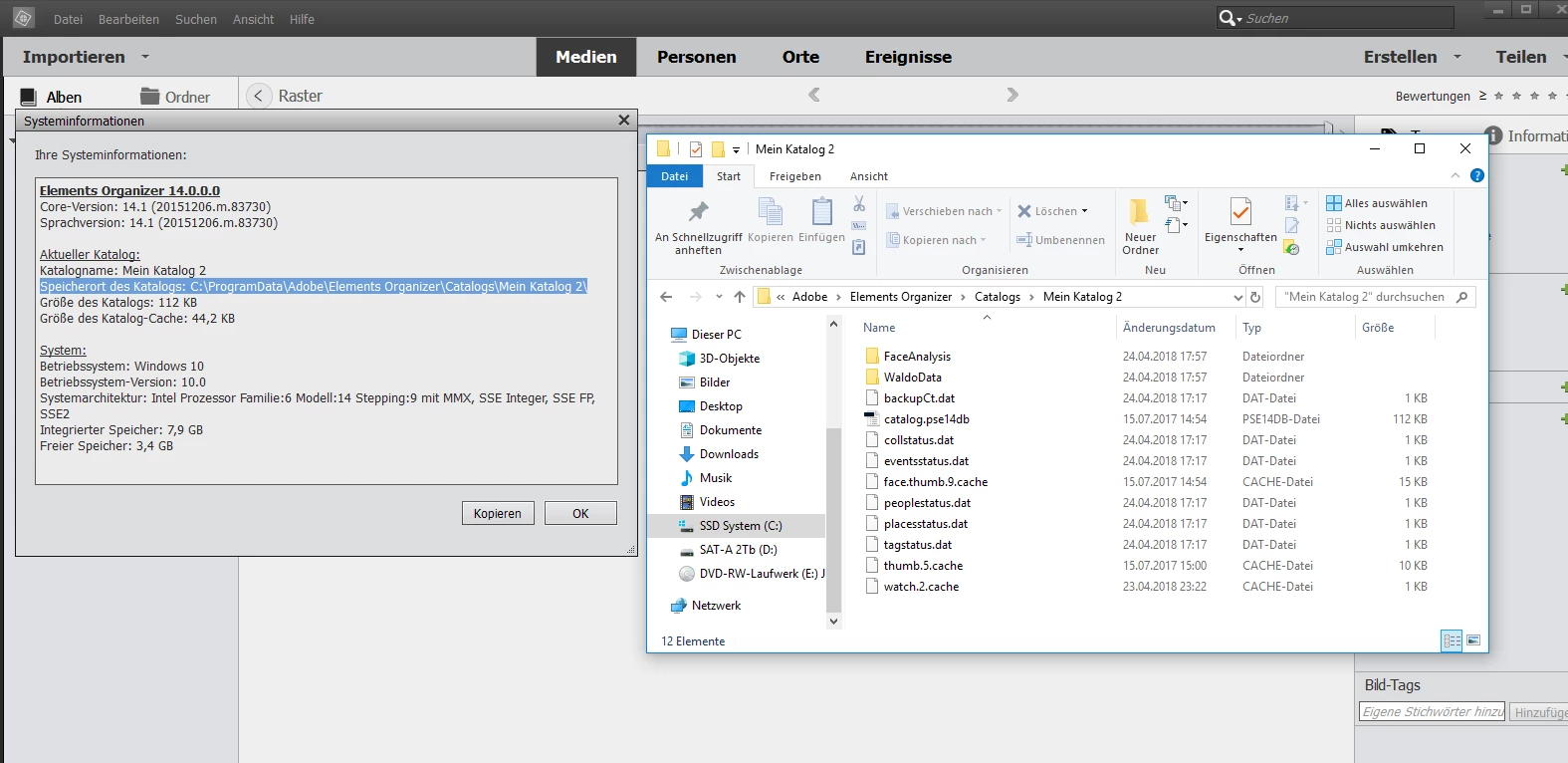 I was able to find the catalogue directory (C:\ProgramData\Adobe\Elements Organizer\Catalogs\Mein Katalog 2\), but now the meanwile 2 catalogues have NO pictures (neither in PSE 14 nor in PSE 2018)…