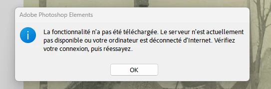 Je viens d'installer Photoshop element 2024 bet j'ai voulu faire un essai de colorisation d'une photo noir et blanc. Mais j'ai un message d'erreur me disant que la fonction n'a pas été télécharger ou problème de connexion internet (voir photo jointe). Ma connexion internet est bonne. Que se passe t-il ?