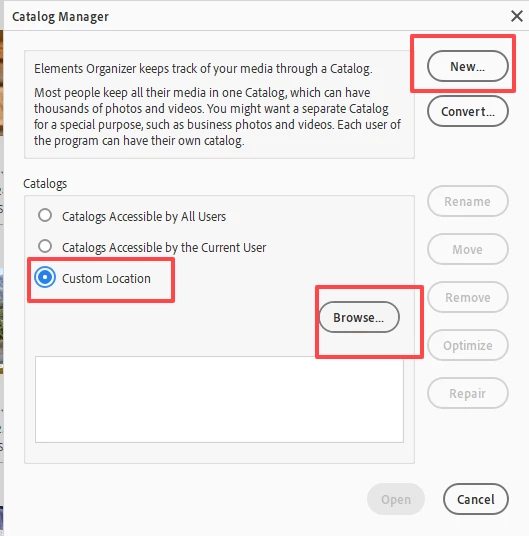 If you have already created the catalogue, you can move it to your E drive using Windows File Explorer. Once it is in the new location, double click on the catalog.pseXXdb file (where XX is the version number of your program) and the catalogue will automatically open in the Organizer.