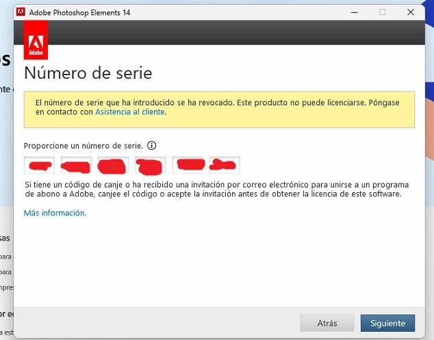 Tengo una licencia de Adobe PhotoShop Elemnts 14 y al intentar instlarlo en un ordenador con Windows 11 me aparece un mensaje que dice "El número de serie que ha interoducido ha sido revocado", pero el número de serie es correcto. En cambio cuando lo intento con un ordenadro con Windows 7 en el porceso de activación me aparece que no se pudo acivar porque el ordenador no tiene acceso a Internet, pero el ordenador si tiene internet.