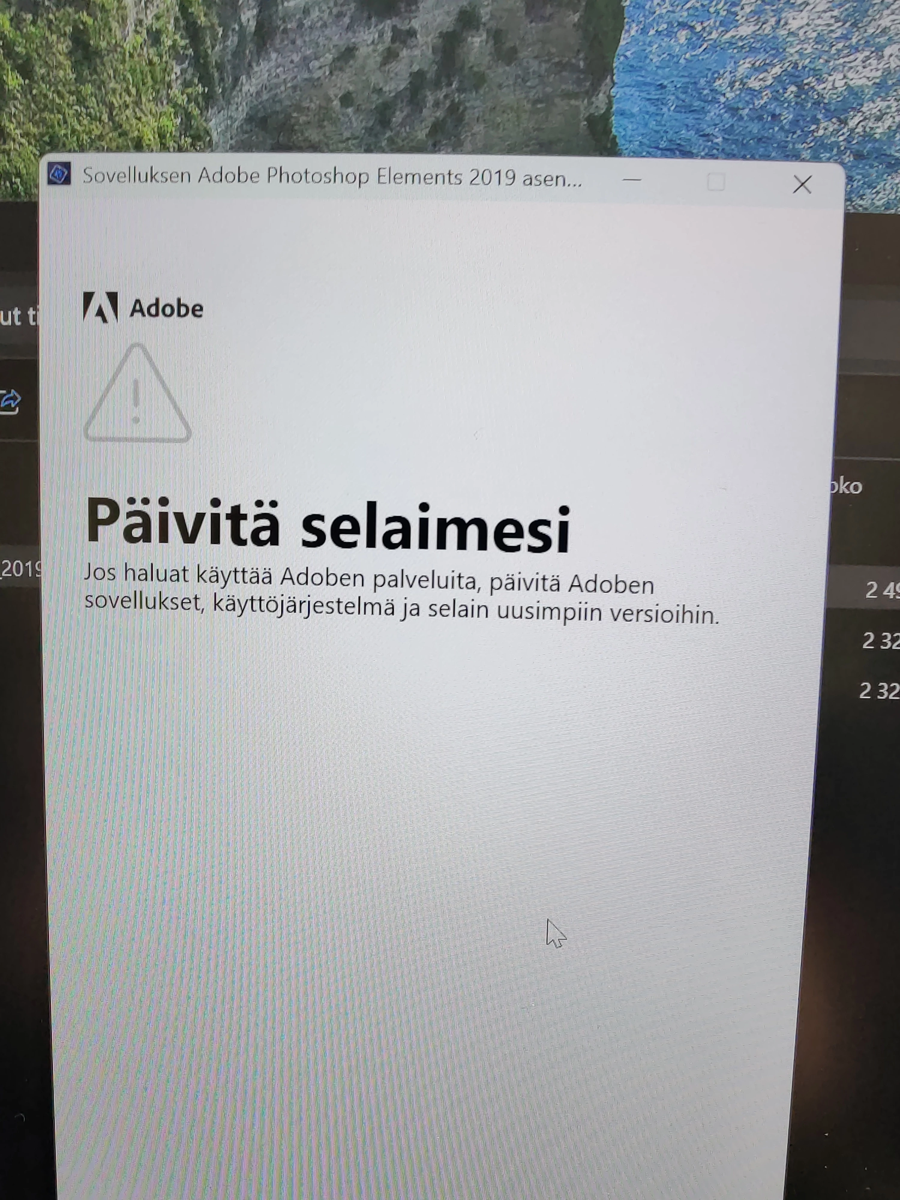 I downloaded the Elements 19 installation file from my Adobe account. (I have a license code) I can't install it because I get this window. (sorry for the Finnish) I have a new Lenovo Legion slim 5 AMD R7 Nvidia RTX 4060 laptop. 2024 released.