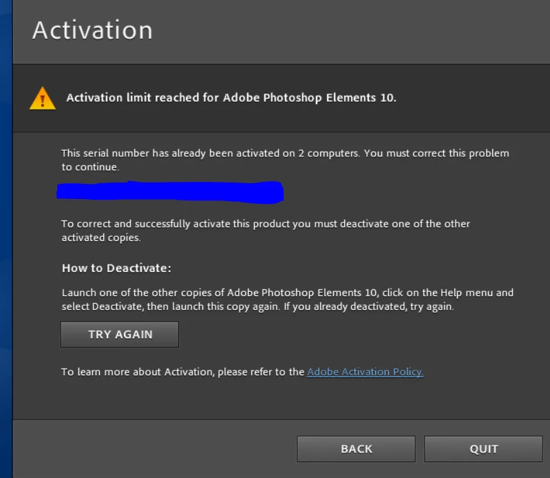 I installed Photoshop Element 10 on my new computer and deactivated it on my old computer but it still gave me this error. I do not have any other computer where it could be installed except on my old computer. Please if there is some one who can help!