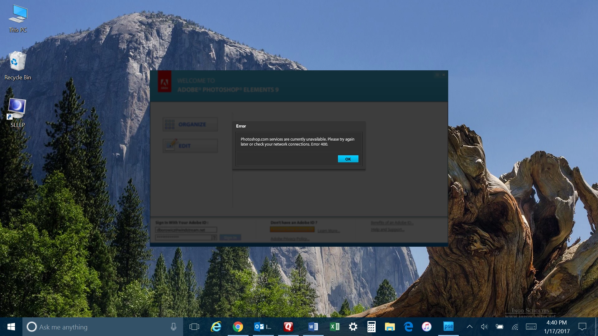 I can use my adobe user id and password on the web. But when I try and use it in elements 9 it says it is not valid.