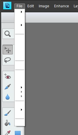 However, when i click photo editor, things go wrong. The photo editor loads up but incorrectly. The 'Quick' and 'Expert' and 1 more option that i cant remember (Maybe it was guided or something idk) are not there and there are just blank Buttons. When i click the menu options such as File or Edit Nothing appears but a blank dropdown, (Picture below) When i click where the options are meant to be, they still act as they should.