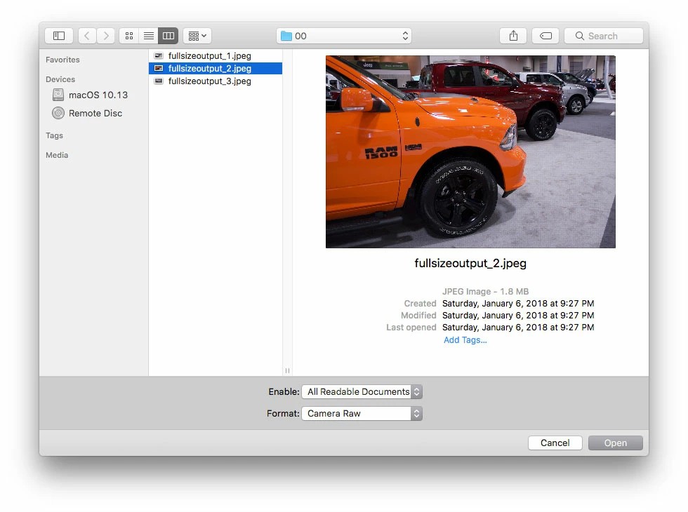 Now when clicking on a JPEG file and selecting Camera RAW the open button is greyed out.