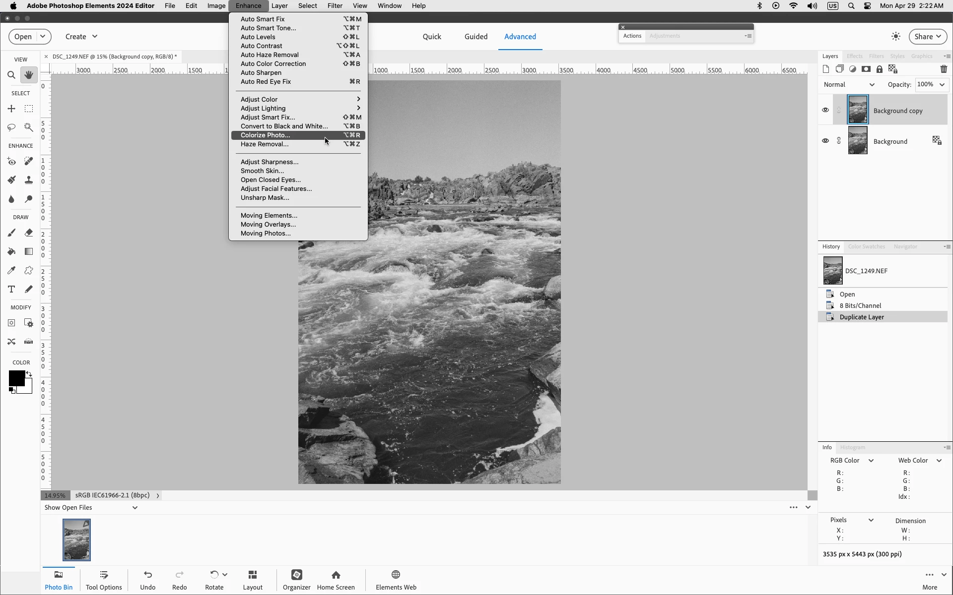 Does it make any difference if in Advanced mode you go to Enhance>Colorize Photo?