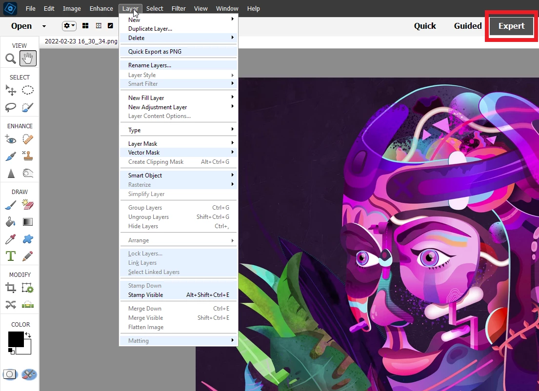 I just installed PSE 2022. All the Layers options are grayed out. Image is 8 bits.