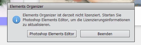 Nach dauerhaft problemlosem Einsatz des Organizers erhalte ich heute beim Öffnen des Organizer die Meldung: "Elements Organizer ist derzeit nicht lizenziert. Starten Sie Photoshop Elemets Editor, um die Lizensinformationen zu aktualisieren." Beim Start des Editor sehe ich keine Möglichkeit die Aktualisierung vorzunehmen. Wie kann ich das machen? Ein mehrfaches Schließen und wieder Öffen des Programms brachte keine Lösung.