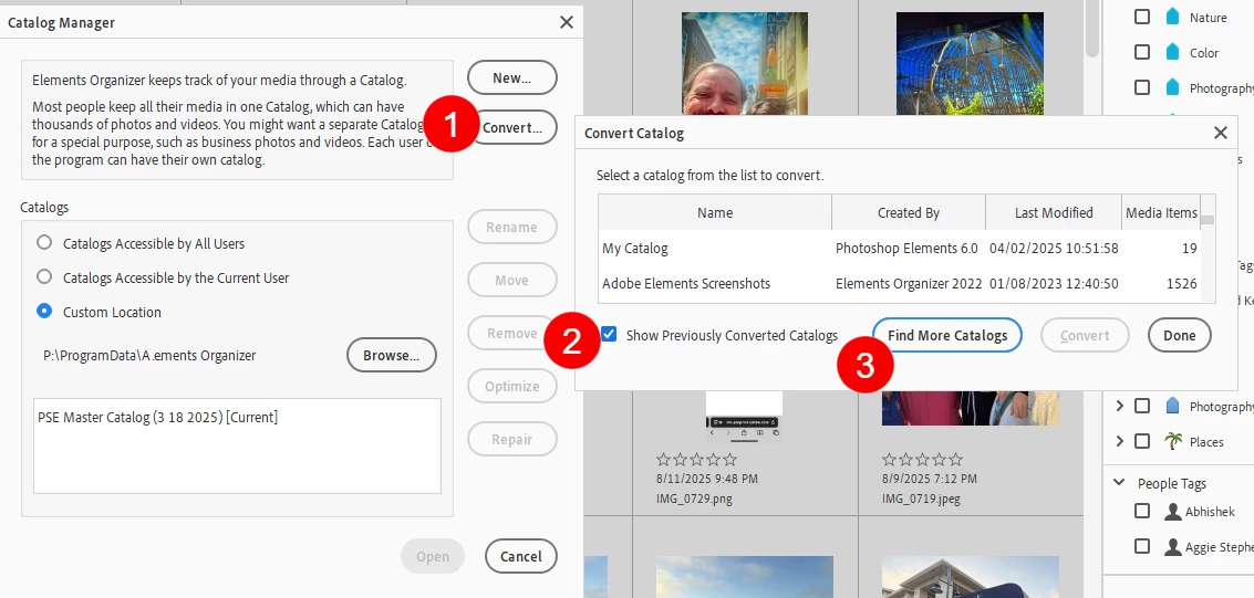 I've just upgraded from elements 2018 to 2025. I then converted my 2018 catalog. Then followed process (using drop down menu under tags) to copy tags info for 2018 to a folder, then to 2015. Result is that tags are visible in 2025, but no photos attached (but all the photos are there). Any help gratefully received.