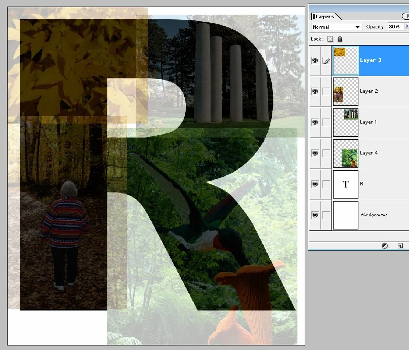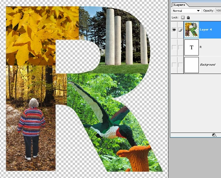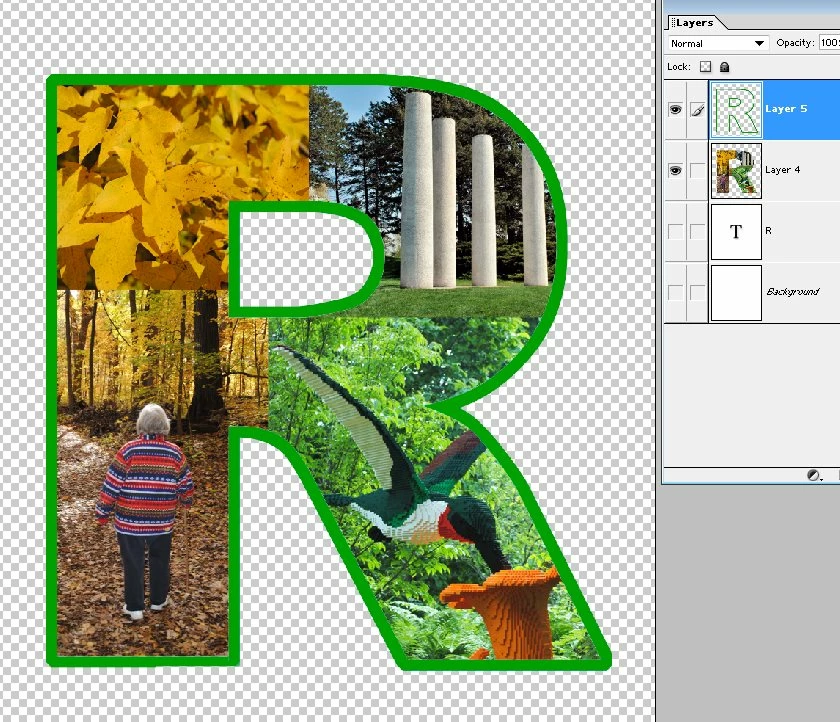 Using the Move tool, resize and reposition the pictures as needed so that the entire R is covered.